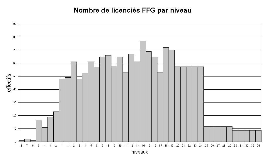 Parmi les joueurs ayant conservé leur niveau déclaré au moment de leur première prise de licence (donc sans participation à un tournoi pris en compte dans l’échelle), un très grand nombre ont conservé l’ancien « plafond pour débutant » qui a longtemps été de -1950 points. Il en résulte un sureffectif important à ce niveau, probablement trois ou quatre fois trop important. Il est très probable que la majorité de ces joueurs sont aujourd’hui surclassés et devraient être mieux évalués avec la nouvelle échelle qui a été « allongée » jusqu’à 30e kyû. D’autres ont évidemment progressé, mais leurs progrès ont trop rarement été pris en compte faute de participation à des tournois « reconnus ».