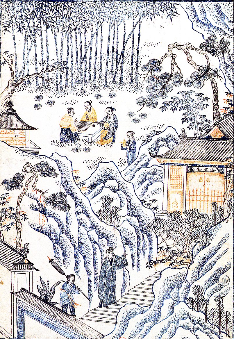 Dans ce recueil de 10 planches, le site du mont Hu, situé dans la province du Zhejiang, l'auteur a voulu représenter ce lieu touristique apprécié des habitants de Hangzhou : on remarque la mine réjouie de certains, cette impression de gaieté étant renforcée par l'ajout des couleurs. De nombreux lettrés aux allures raffinés suivis de leur domestiques ou en groupes viennent s'y délasser et trouver un peu de fraîcheur. Outre que l'on peut y jouir d'un panorama exceptionnel sur la rivière depuis une haute terrasse, l'endroit est propice aux activités de loisir, conversations entre amis, jeu de weichi, collations légères.