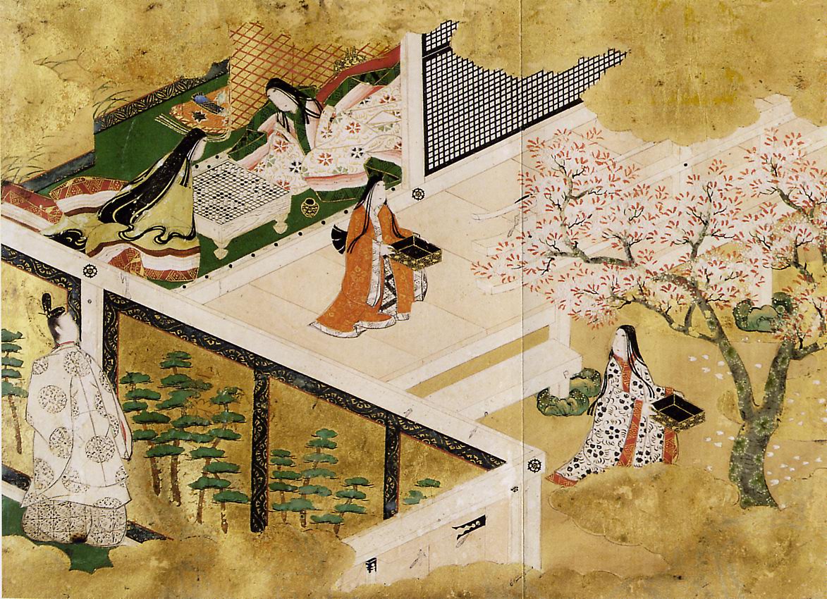 Livre XLIV, la rivière aux bambous, du dit du Genji, illustré par Tosa Mitsuyoshi, Jeu de Go et pétales de fleurs