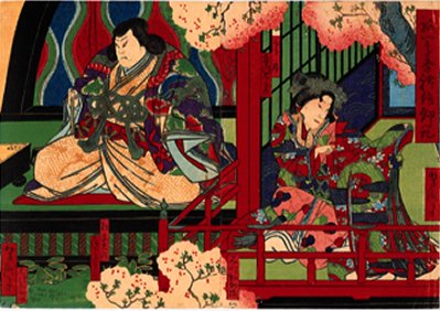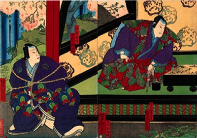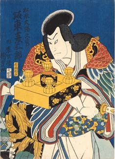 Kunisada, 1860 : Tokichi présente un bol de Go à Daizen |