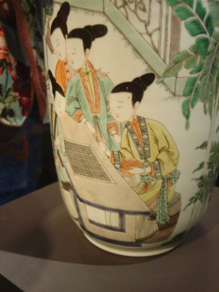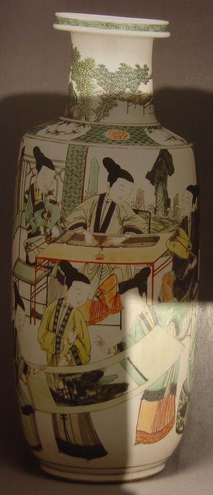 N°35 : Vase représentant les quatre arts : la peinture, la musique, la calligraphie et le jeu de go Manufacture de Jingdezhen (Jianxi) Hauteur 46cm Diamètre18cm Dynastie Qing (XVIIIe siècle) Porcelaine famille verte