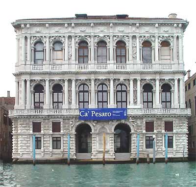 A peine débarqué, nous roulons nos valises vers les embarcadères et munis de nos pass pour 3 jours, nous empruntons le vaporetto N°1 qui nous conduit en empruntant le grand canal par petits sauts de puce entre les arrêts jusqu'à San Stae. Nous quittons le monde flottant pour nous engager dans la ville à travers des ruelles de 1 mètre de large ; deux ou trois ponts nous permettent de franchir d'étroits canaux et nous sommes face à face avec l'entrée d'un musée : c'est le musée d'art moderne ( pas trop) qui abrite également le rival vénitien du musée Guimet. Attiré par l'affiche et par l'architecture brillante du Ca' Pesaro, le palais en bordure du grand canal qui abrite les musées, nous nous promettons de revenir.