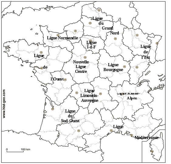 - Ligue de l’Ouest : ancienne Ligue de l’Ouest moins le dépt 37