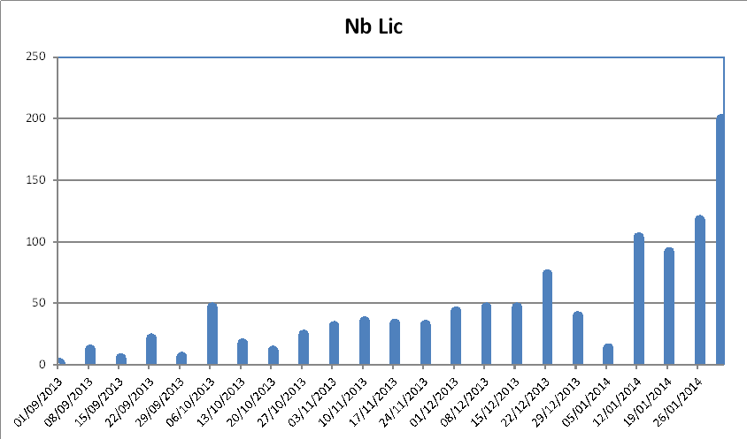 Le graphique donne le nombre de licences prises par semaine depuis Septembre 2013 jusqu'au 31 Janvier 2014.