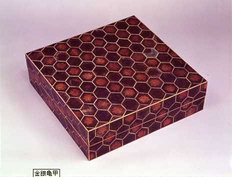 金銀亀甲碁局龕 (きんぎんきっこうのききょくのがん) 縦53.7 横53.1 高15.9 木画の技法で装飾した碁盤の容器。合口造りの箱で、大ぶりな金銀の亀甲文様は金銀箔の表面に透明な角質の薄板を貼っている。国家珍宝帳記載の献納宝物。 |