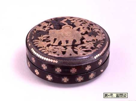 Voici un autre trésor du Shôsôin : une boîte à pierres qui est décorée d'un petit éléphant blanc. 分類:収納具 寸法:径11.4 高約4.4 棊子(碁石)の容器。薄い銀板を象の姿に切り透かした文様で飾る。国家珍宝帳所載の品で、百済の義慈王が藤原鎌足に贈った赤漆欟木厨子(現存せず)に納められていた。 |