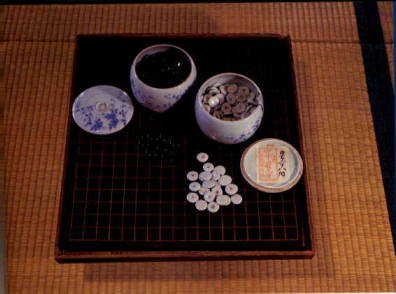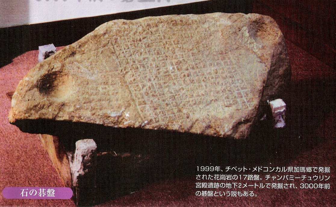 Dans une revue coréenne de Novembre 2000, on peut admirer ce goban en pierre, découvert par hasard dans la ville de KANGJIN située dans la province de JUNNAM dans le sud-ouest de la Corée. On ne connaît pas sa date de fabrication, mais on pense qu'on a du s'en servir avant le 14e siècle. En effet, on y voit une trace de la gravure d'une fleur qu'on ne peut pas trouver sur les jeux en pierre fabriqué après le 14e siècle. C'est une découverte importante, car ce goban en pierre est probablement le plus ancien parmi ceux qui existent en Corée. |