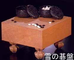 Dans l'histoire du Go raconté au juniors, on peut trouver l'histoire de ce goban appelé Yuki ou Neige qui est exposé au rez-de chaussé de l'immeuble de la Nihon-kiin à Ichigaya. 雪(ゆき)の碁盤(ごばん)は、東京市ヶ谷(とうきょういちがや)の日本棋院(にほんきいん)1階(いっかい)に展示(てんじ)されています。 A partir d'un même kaya, trois goban intitulé Neige (Yuki), Lune (tsuki) et Fleur (hana) 同(おな)じ一本(いっぽん)の榧(かや)の木(き)から雪(ゆき)・月(つき)・花(はな)の三面(さんめん)の名盤(めいばん)が作(つく)られ、徳川幕府(とくがわばくふ)の碁所(ごどころ)で、打(う)ち初(ぞ)めなどに使用(しよう)されました。 |