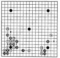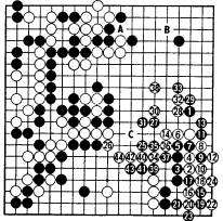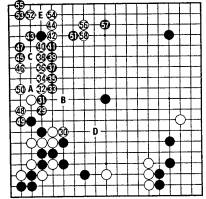 Normalement, en 35, noir connecte en B, menaçant à la fois C et D, mais la poussée noire de 33 à 41 est également une très bonne façon de jouer .