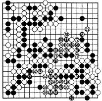 il valait mieux ne pas jouer 77 et 81.Blanc 84 est un sacrifice destiné à enfermer le groupe noir, mais, grâce à la coupe en 89, noir s'en sort car les pierres blanches du centre sont prises après 95 (dia.