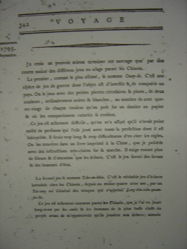 Ayant lu dans une Go-World qu'un ambassadeur hollandais avait écrit une description du jeu de weiqi à la fin du 18e siècle, je décidais de profiter d'une journée de liberté(sans doute un de ces fameux jour de RTT que nous accordait mon employeur), ce Vendredi 18 Janvier 2002 pour aller consulter son livre à la BNF.