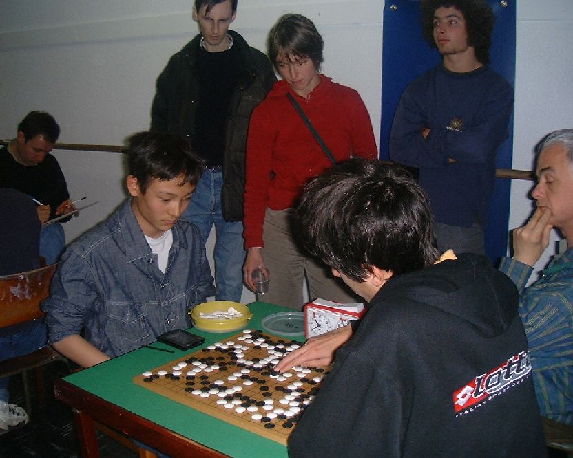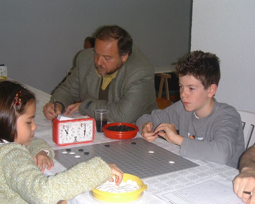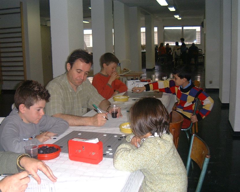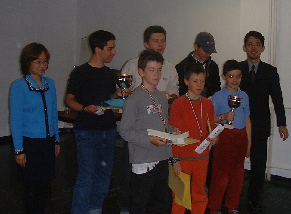 La remise des prix : au premier rang, les primaires ; derrière, les collégiens. Encadrés par deux professionnels japonais : Chizu Kobayashi 5 Dan et Toshifumi Mizuma 6 Dan