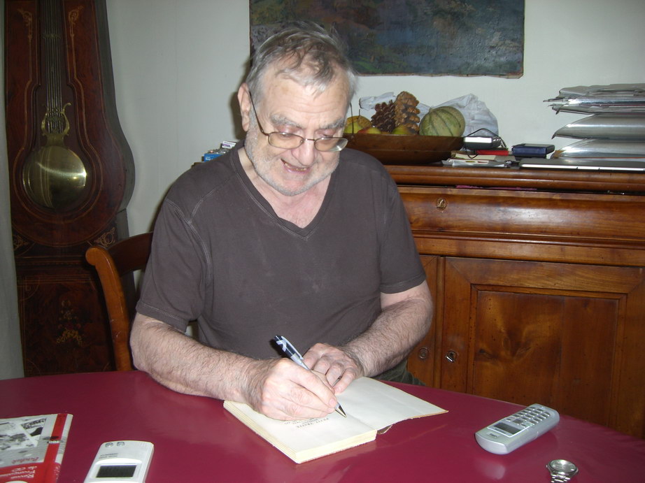 Pierre Lusson me dédicace le petit traité : un homme se tourne vers son passé. |