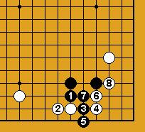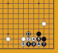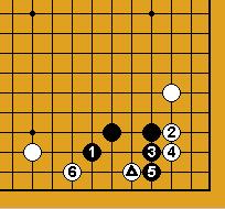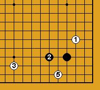 Le diagramme 3 présente une variante où Noir sépare la pierre D de la pierre blanche de milieu de bord. Cette réponse est trop bonne pour Blanc car Noir est surconcentré. Blanc a pu jouer des coups territoriaux efficaces en 2, 4 et 6. Les diagrammes 4 et 5 montrent ce qui se passe lorsque Noir veut séparer la pierre D de la pierre blanche de milieu de bord.