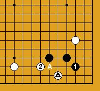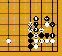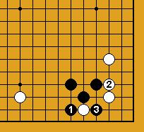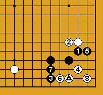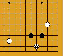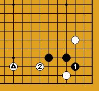Diagramme 7 .Une autre variante de la prise du coin par Blanc. Noir est vivant, mais avec un territoire minimal et la pierre blanche de milieu de bord annule l'influence qu'il pourrait avoir.