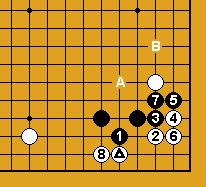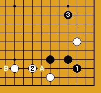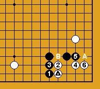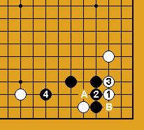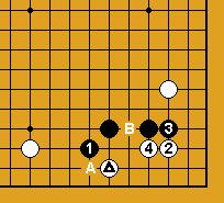 Diagramme 4. Il est manifeste que Noir a trop de faiblesses pour pouvoir jouer aussi agressivement à la fin de la séquence, on voit que la position noire a deux faiblesses, en A et B. La connexion noire en B éliminerait la tare du groupe noir (il ne pourrait plus être séparé en deux morceaux), mais la position globale noire est très mauvaise :
