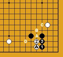 Diagramme 8. La réfutation correcte du hamete D. C'est le tsuke N1, forçant B2 et N3. A ce stade, si Blanc coupe en A, la suite est Noir en B, Blanc en D et Noir en C. La forme blanche est un peu légère sur le bord Sud, et la pierre du bord Est est très abîmée.