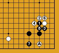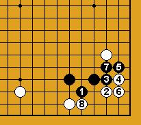 La situation de départ est montrée sur la figure 1. Le diagramme 1 montre l'ordre des coups. B3 ne semble pas sente à Noir, qui fait tenuki (joue ailleurs) avec son coup N4. Le hamete est joué par Blanc avec le coup B5. Nous allons maintenant analyser les différentes réponses possibles de Noir.