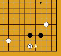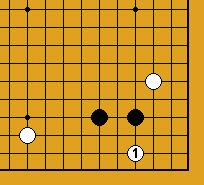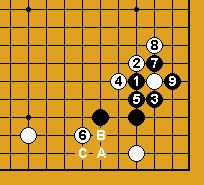 Diagramme 6. On peut voir ici un autre piège où Noir peut tomber faire tsuke avec N 1 sur D. Blanc entre alors au san-san pour prendre le territoire du coin. Dans cet exemple, la situation globale est très satisfaisante pour Blanc :