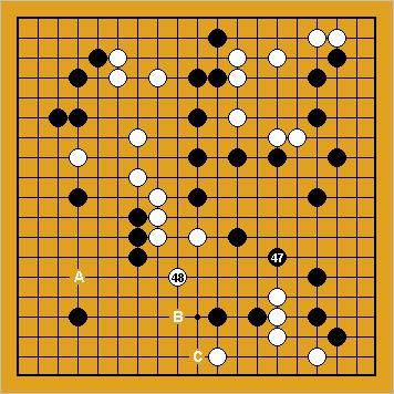 Figure 12 (coups 47-48) Blanc 48 est un très bon point. Les joueurs l'ont négligé jusque-là, mais c'est bien l'un des points vitaux de cette situation.