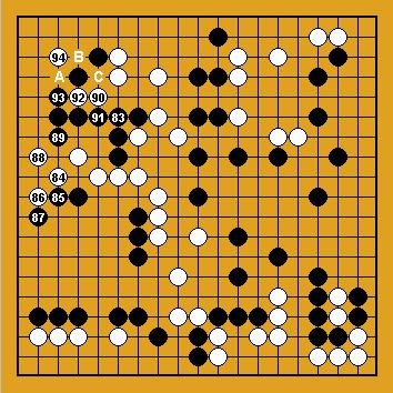 ( coups 84 à 94 ) Noir 89 vise à supprimer les yeux de blanc, mais l'initiative aurait pu être utilisée pour capturer le groupe faible du nord. Si Minami a joué un coup douteux dans cette partie, c'est bien le coup 89. Koyama se sent alors tout ragaillardi et se précipite sur la menace de coupe en 90, suivie de la poussée en 92 et du magnifique placement en 94. Problème 17