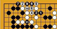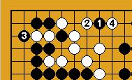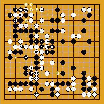 ( coups 95 à 122) Koyama, pensant qu'il n'a plus à s'inquiéter pour le bord nord, se tourne vers le centre. Blanc 102 est sente : si noir joue ailleurs, blanc coupe en 'F' . Après la coupe en 109, blanc fait des yeux avec 110. Noir 111 est une connexion nécessaire. Si noir essaye de détruire les yeux de blanc en jouant 112, blanc fera un œil en jouant 'G' et le deuxième sur le bord ouest. Pour attaquer le groupe blanc du bord nord-ouest, noir doit d'abord capturer deux pierres blanches avec 121. S'il joue d'abord 1 du dia.19-1 de référence, blanc joue 2, noir est obligé de retourner prendre deux pierres, et blanc peut vivre avec 4. Quand Koyama a joué 122, Minami a cru à une erreur. Il pensait que blanc n'avait pas vu la séquence du dia.19-2 de référence, qui entraîne la mort du groupe blanc. Dans cette séquence, le coup crucial est noir 5. |