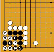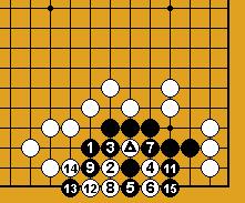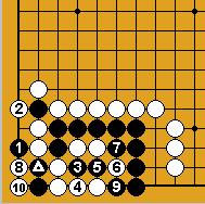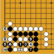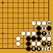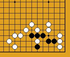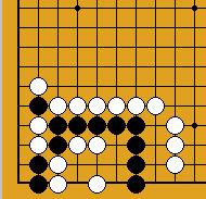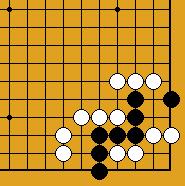 A part un piège classique sur le carré du charpentier (Dia.21 et Dia.22), je ne connais cette séquence que dans les positions assez artificielles des problèmes présentés ici ; comme on voit, l'idée est le refus du sacrifice ordinaire sous les deux pierres (en 6 du Dia.22) qui ne réduirait en fait pas le nombre de libertés noires ; la faiblesse est de même nature que celle d'un nœud de bambou (damezumari) et la séquence est donc un cas (très) particulier de jeu de voleur (oiotoshi).