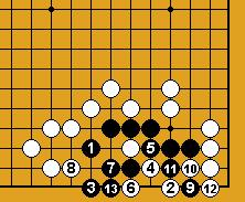 ![]() Dia. 22 : N 12 en 6 ! Blanc ne peut pas connecter et le deuxième œil réapparaît sous les pierres 9 et D. |