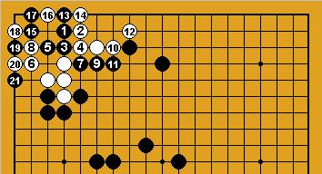 Diagramme 2 A la suite des coups noirs 57 à 63, noir 65 est important car il induit blanc 66. Pourquoi ? Parce que sinon Noir pourrait enfermer blanc dans le coin nord-ouest, d'une part, transformer son ascendant en territoire, mais aussi à cause de l'attaque possible du coin blanc présentée ci-contre.