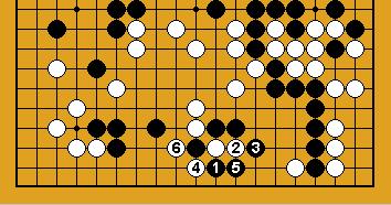 Diagramme 3 Les coups blancs 70 à 88 sont annonciateurs d'un tournant décisif de la partie. Après blanc 90, nombre de spectateurs songèrent que l'attaque blanche aboutirait à une pénétration du côté noir à la façon dont celle-ci est décrite sur ce diagramme. Mais c'était là mal connaître Takemiya. |