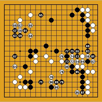 Noir 53 est un coup à l'image de l'ensemble de la partie. Il vise à transformer la zone d'influence noire en territoire dûment fortifié. Il importe peu de savoir si les coups blancs consécutifs sont tous entièrement contraints (ce qui semble être le cas) ou non, pour constater que le résultat local est manifeste : sur ce côté, ce coup a bloqué l'extension blanche en obligeant Blanc à se contenter de la prise d'une pierre noire.