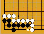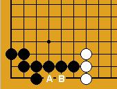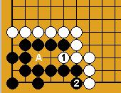 Nous pouvons cependant faire comme dans le dia.2 et imaginer le dia.9 : l'échange 1-2, pour les raisons vues plus haut, est logique (et quasiment inévitable). Combien noir a-t-il de points maintenant ? Deux yeux, plus deux points à gauche de 2, plus un demi en "A" ! Donc, sans tenir compte des deux yeux du coin, deux points et demi. On peut donc considérer que dans le dia.8 noir a, en "A" et "B", (½ * 2,5) points, soit 1 ¼ point, ce qui fait au total 3 ¼ points. |