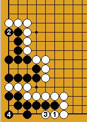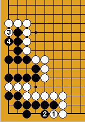 Dia.12. Si noir répond, il répondra aussi à 3 en 4, et cette fois il a huit points. On peut donc en conclure que le coup "A" du dia.10 est privilège blanc et que noir a quatre points dans le coin. Il est bien évident que ces calculs ne sont valables qu'en moyenne, et ne donnent qu'une valeur de référence pour une position. Si on approche de la fin de la partie, le demi point du dia.1 se transformera en un point noir ou zéro, et il faut pour faire un calcul précis tenir compte de qui a l'initiative. |