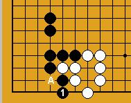 Dia.11 Le coup correct (après avoir vérifié que la faiblesse en A ne laisse pas trop d'aji dans le coin) est noir 1 (noir A au lieu de 1 perd 2/3 de point). |
