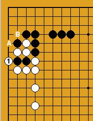 Si blanc capture en 1, on ne peut pas immédiatement calculer la différence avec le dia.1, mais on peut cependant remarquer deux choses : d'abord, si noir répond en A immédiatement, cela revient à dire que blanc a pu capturer en sente, mais la valeur de la capture est trop importante par rapport à celle des coups ultérieurs (A pour noir, B pour blanc), pour tolérer qu'il soit joué en sente. |
