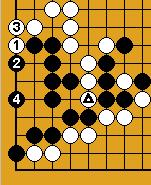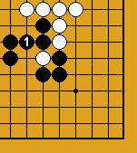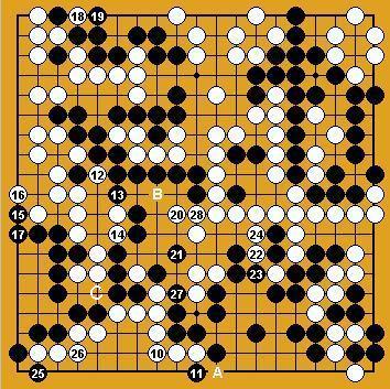 Blanc 20 est quasiment sente, car le groupe noir est toujours coupable en C. Noir 21 en réponse a d'autres buts (voir plus loin, dia.3). Blancs 22-24 valent trois points en double gote. Noir 27 menace de couper au moins une pierre avec 28, et blanc se défend. Le coin blanc est maintenant isolé, et noir peut le réduire en sente. Au vu de ceci, il semblerait que blanc 22 aurait été meilleur en 25.