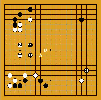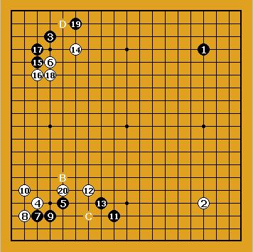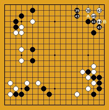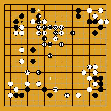 Blanc joue le dernier gros point en 68. Ensuite, la partie entre déjà dans la phase du yose où les deux adversaires vont montrer leur capacité à compter la valeur exacte de leurs coups. Blanc gagne de 0,5 point |