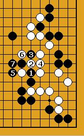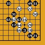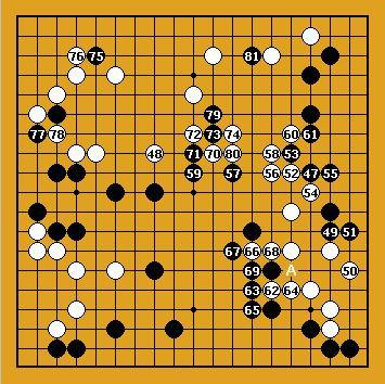 69 : C'est à partir du coup suivant que le cours de cette partie est passée d'un équilibre serein entre deux moyô à un combat furieux à la vie à la mort. Il est intéressant à ce point de recueillir différents avis. 70 Variantes. Le coup 70 semble en conclusion un coup abusif qui a donné à Noir une chance de contre-attaquer et ainsi de compliquer la partie. Comme Blanc a l'avantage au niveau du territoire, il aurait du jouer plus prudemment. 71-90 : Le défi Noir 74 : La réponse la plus sévère à l'attaque de Noir constituée par 71 et 73. 76 : Le seul coup possible comme le montrent les différentes variantes 80 : A nouveau Blanc joue la résistance maximale et refuse le compromis. 81 : Noir semble jouer de ci de là au hasard mais comme on