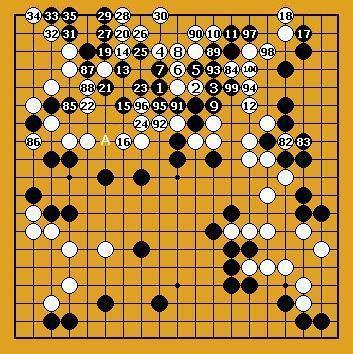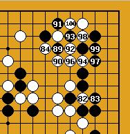 Cho : Le coup 90 me surprit. Je n'avais jamais envisagé qu'Otake essaye si férocement de me capturer. Voici la séquence que j'avais envisagée. Noir n'a pas pu vivre mais sa dernière capture a fortement réduit le territoire blanc.