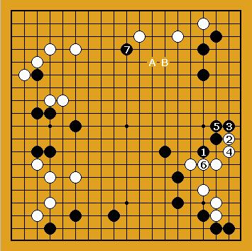 Variante du coup 39 Chô pense qu'il aurait peut-être du suivre cette variante. Cette séquence est sente pour Noir et maintenant Noir peut réduire le moyô Blanc avec 45 ou A ou B