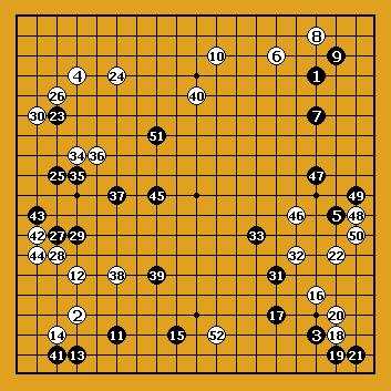 Variante du coup 48 Noir aurait réduit le moyô blanc avec 51. Cependant, si Blanc envahi bravement avec 52, Cho pense qu'il serait en difficulté.