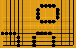 Pour constituer un territoire, il faut profiter des frontières naturelles du Goban : ce sont les bordures du jeu. Dia. 1. : Pour constituer un territoire de 12 points, il faut seulement 7 pierres dans le coin, 10 pierres sur le bord, et 14 dans le centre. Il est donc beaucoup plus rentable d'investir d'abord dans les coins, ensuite sur le bord et finalement de s'occuper du centre |