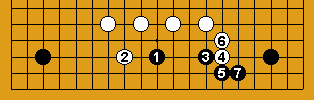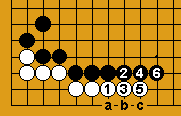 En début de partie, jouer sur la 1ère ligne est idiot. Cela ne rapporte que des pierres pouvant éventuellement être attaquées. Dans le diagramme 2, Blanc joue sur la 2ème ligne et fait à chaque coup 1 point de terrain. En début de partie, c'est trop peu et donc mauvais. Si vous êtes trop gourmand et essayer de construire du terrain sur la 5ème ligne, vous risquez une infiltration sous vos propres armées. Dans le Dia. 3, Blanc a investit 4 pierres sur la 5ème ligne, mais Noir parvient facilement à construire un territoire sous le Blanc. |