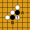 Lorsque Blanc joue en 1, Noir peut s'échapper en A ou en B mais pas les deux. Blanc pourra capturer l'une des deux pierres. |