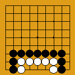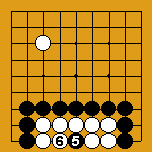 Diagramme 3 : Si Noir poursuit son idée, il peut jouer en 5 ; Blanc peut capturer en 6 mais il n'a toujours qu'une liberté: Noir peut rejouer en 5 et capturer toutes les pierres.