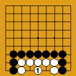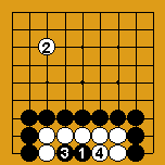 Diagramme 4 : Si c'est à Blanc de jouer, il peut sauver son groupe en jouant 1 et en faisant alors deux yeux. |