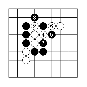 Diagramme 8 : Le coup bloque à distance les pierres delta. Vous pouvez vérifier que le shichô qui commence avec 2 en 4 ne fonctionne pas pour Noir. |