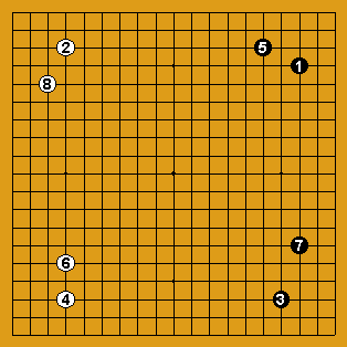 Dans ce début de partie, Noir et Blanc décident de renforcer leur emprise sur les coins. On voit ici les 3 exemples principaux de verrous appelés également shimari. Coin Nord-Est et Nord-Ouest : Kogeima shimari, le verrou le plus solide Coin Sud-Ouest : Ikken shimari solide et donnant une grande valeur au bord Sud. Coin Sud-Est : Ôgeima shimari : plus ambitieux mais également plus lâche |