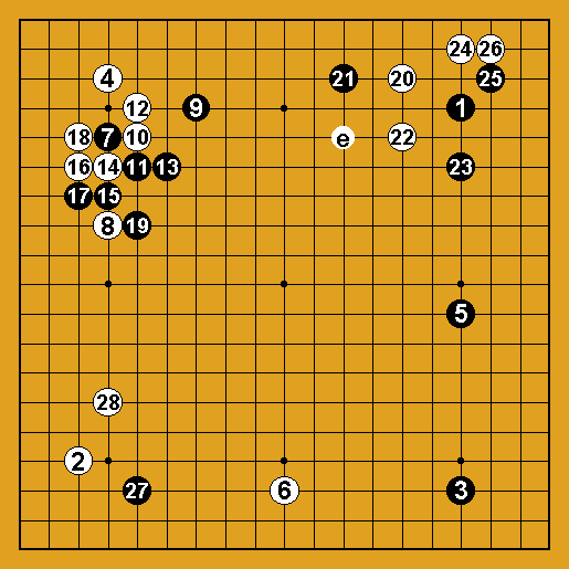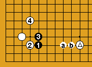 Le coup 5 constitue un "Fuseki chinois" très populaire actuellement lorsque Noir décide d'adopter une stratégie de grands moyo. L'extension 6 n'est pas très bien placée: un shimari en 27 parait meilleur. D'autre part, si nous supposons que Noir attaque le coin sud-ouest (dia. 1), après les échanges ordinaires 1-4, il peut s'étendre en 'a', ce qui ne serait pas possible si la pierre delta était en 'b' par exemple.