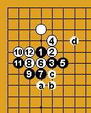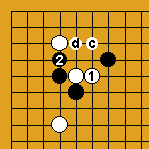 3. Dans cette situation, il serait désastreux pour Blanc d'échanger 'a' (8 de la fig. 1) contre 'b' : Noir se trouverait renforcé et ne pourrait plus être coupé en 'c'. Par contre, 'd' parait un bon point pour Noir. |
